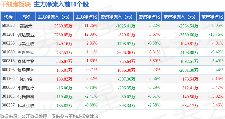 从资金流向上来看,当日干细胞板块主力资金净流出4.68亿元,游资资金净流入1.44亿元,散户资金净流入3.25亿元。干细胞板块个股资金流向见下表: