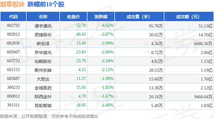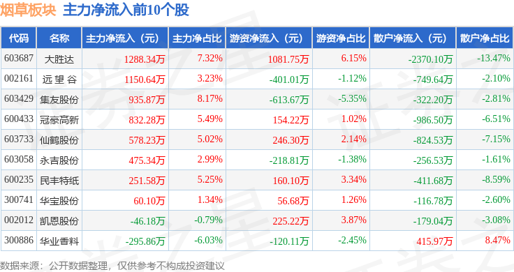 从资金流向上来看,当日烟草板块主力资金净流出6.73亿元,游资资金净流入1.6亿元,散户资金净流入5.14亿元。烟草板块个股资金流向见下表: