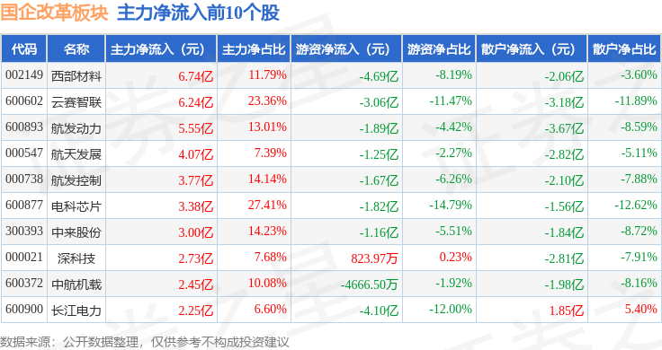 从资金流向上来看,当日国企改革板块主力资金净流出191.56亿元,游资资金净流入28.83亿元,散户资金净流入162.73亿元。国企改革板块个股资金流向见下表: