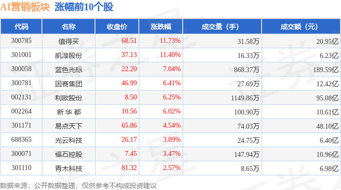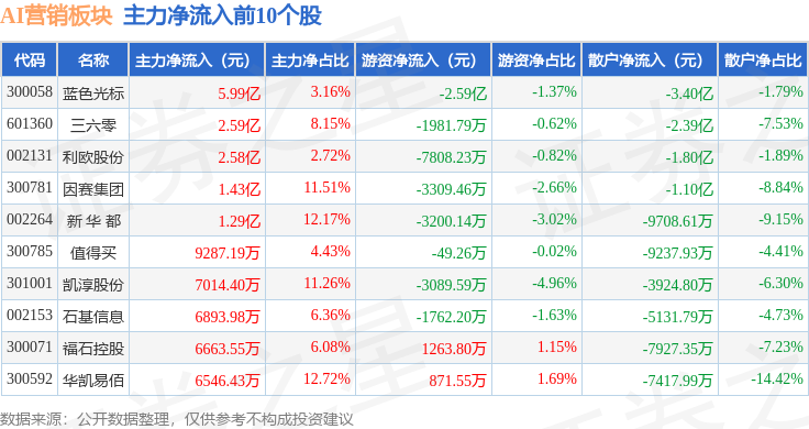 从资金流向上来看,当日AI营销板块主力资金净流入2.71亿元,游资资金净流入5542.9万元,散户资金净流出3.26亿元。AI营销板块个股资金流向见下表: