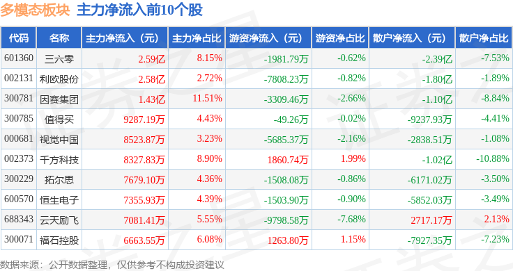 从资金流向上来看,当日多模态板块主力资金净流出14.59亿元,游资资金净流入5.47亿元,散户资金净流入9.12亿元。多模态板块个股资金流向见下表: