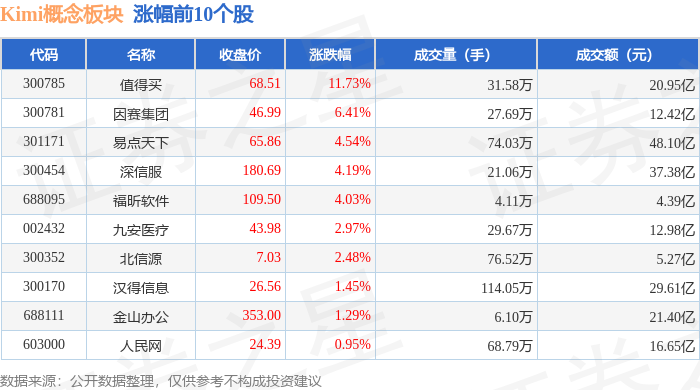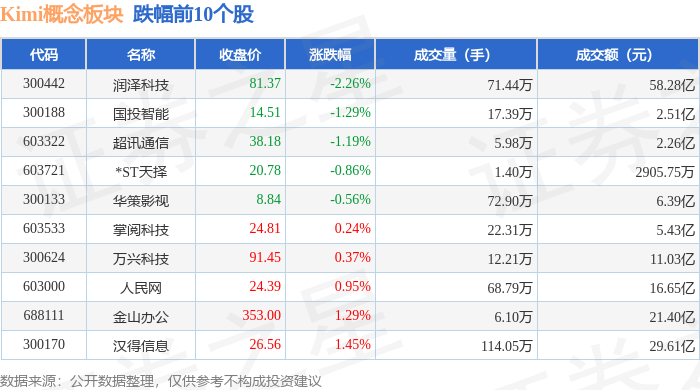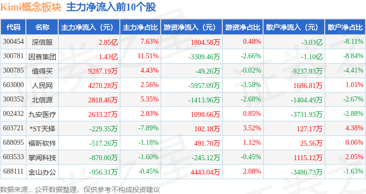 从资金流向上来看,当日Kimi概念板块主力资金净流出50.22万元,游资资金净流入2.01亿元,散户资金净流出2.01亿元。Kimi概念板块个股资金流向见下表: