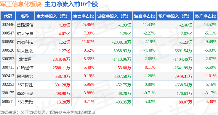 从资金流向上来看,当日军工信息化板块主力资金净流出1.4亿元,游资资金净流出2.82亿元,散户资金净流入4.23亿元。军工信息化板块个股资金流向见下表: