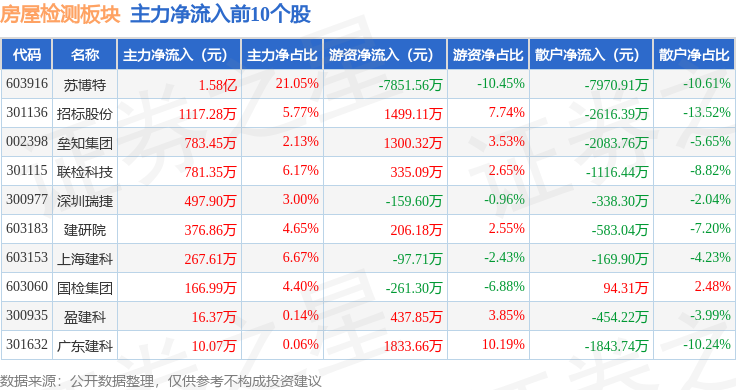 从资金流向上来看,当日房屋检测板块主力资金净流出6886.97万元,游资资金净流入1407.92万元,散户资金净流入5479.05万元。房屋检测板块个股资金流向见下表: