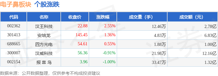证券之星消息,1月27日电子鼻板块较上一交易日上涨0.17%,汉王科技领涨。当日上证指数报收于4139.9,上涨0.18%。深证成指报收于14329.91,上涨0.09%。电子鼻板块个股涨跌见下表: