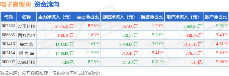 从资金流向上来看,当日电子鼻板块主力资金净流出1.1亿元,游资资金净流出2371.19万元,散户资金净流入1.34亿元。电子鼻板块个股资金流向见下表: