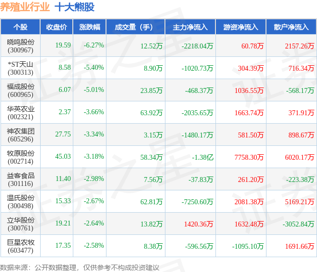 个股表现方面,养殖业行业当日领跌股为晓鸣股份(300967),该股当日报收19.59,下跌6.27%,成交量12.52万,主力资金净流出2218.04万元。*ST天山(300313)以下跌5.4%紧随其后,该股当日成交量8.9万,主力资金净流出1020.73万元。除此之外,福成股份(600965)、华英农业(002321)、神农集团(605296)均进入当日熊股之列。具体个股列表见下表: