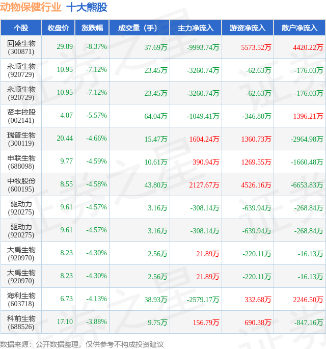 个股表现方面,动物保健行业当日领跌股为回盛生物(300871),该股当日报收29.89,下跌8.37%,成交量37.69万,主力资金净流出9993.74万元。永顺生物(920729)以下跌7.12%紧随其后,该股当日成交量23.45万,主力资金净流出3260.74万元。除此之外,永顺生物(920729)、贤丰控股(002141)、瑞普生物(300119)均进入当日熊股之列。具体个股列表见下表: