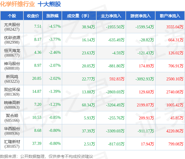 个股表现方面,化学纤维行业当日领跌股为尤夫股份(002427),该股当日报收7.51,下跌4.57%,成交量38.94万,主力资金净流出1955.5万元。优彩资源(002998)以下跌3.77%紧随其后,该股当日成交量16.14万,主力资金净流出635.49万元。除此之外,恒天海龙(000677)、神马股份(600810)、新凤鸣(603225)均进入当日熊股之列。具体个股列表见下表: