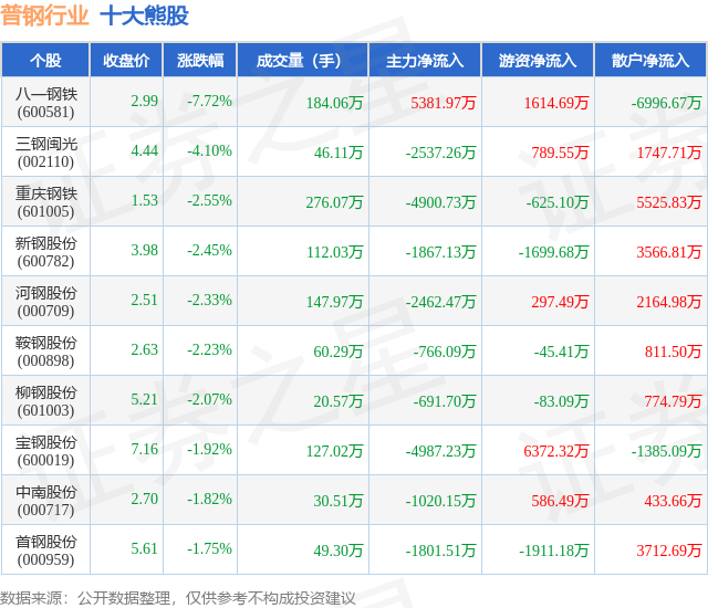 个股表现方面,普钢行业当日领跌股为八一钢铁(600581),该股当日报收2.99,下跌7.72%,成交量184.06万,主力资金净流入5381.97万元。三钢闽光(002110)以下跌4.1%紧随其后,该股当日成交量46.11万,主力资金净流出2537.26万元。除此之外,重庆钢铁(601005)、新钢股份(600782)、河钢股份(000709)均进入当日熊股之列。具体个股列表见下表:
