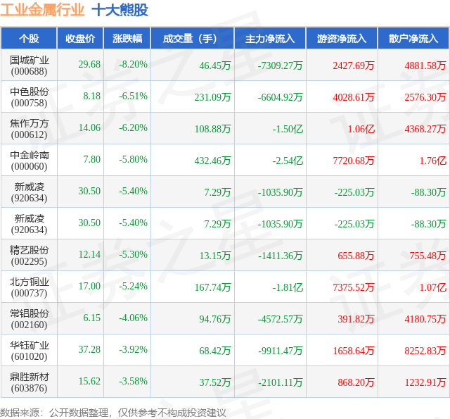个股表现方面,工业金属行业当日领跌股为国城矿业(000688),该股当日报收29.68,下跌8.2%,成交量46.45万,主力资金净流出7309.27万元。中色股份(000758)以下跌6.51%紧随其后,该股当日成交量231.09万,主力资金净流出6604.92万元。除此之外,焦作万方(000612)、中金岭南(000060)、新威凌(920634)均进入当日熊股之列。具体个股列表见下表:
