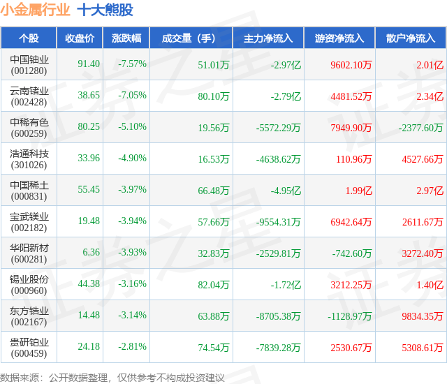 个股表现方面,小金属行业当日领跌股为中国铀业(001280),该股当日报收91.4,下跌7.57%,成交量51.01万,主力资金净流出2.97亿元。云南锗业(002428)以下跌7.05%紧随其后,该股当日成交量80.1万,主力资金净流出2.79亿元。除此之外,中稀有色(600259)、浩通科技(301026)、中国稀土(000831)均进入当日熊股之列。具体个股列表见下表: