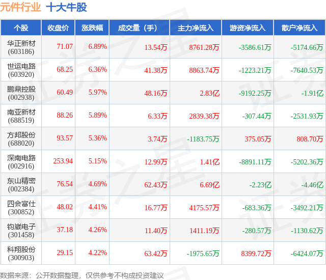 个股表现方面,元件行业当日领涨股为华正新材(603186),该股当日报收71.07,上涨6.89%,成交量13.54万,主力资金净流入8761.28万元。世运电路(603920)以上涨6.36%紧随其后,该股当日成交量41.38万,主力资金净流入8863.74万元。除此之外,鹏鼎控股(002938)、南亚新材(688519)、方邦股份(688020)均进入当日牛股之列。具体个股列表见下表:
