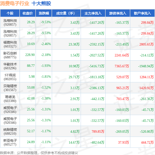个股表现方面,消费电子行业当日领跌股为泓禧科技(920857),该股当日报收28.29,下跌9.53%,成交量3.43万,主力资金净流出1417.2万元。泓禧科技(920857)以下跌9.53%紧随其后,该股当日成交量3.43万,主力资金净流出1417.2万元。除此之外,福蓉科技(603327)、影石创新(688775)、华勤技术(603296)均进入当日熊股之列。具体个股列表见下表: