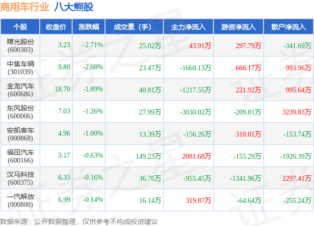 个股表现方面,商用车行业当日领跌股为曙光股份(600303),该股当日报收3.23,下跌2.71%,成交量25.02万,主力资金净流入43.91万元。中集车辆(301039)以下跌2.68%紧随其后,该股当日成交量23.47万,主力资金净流出1660.13万元。除此之外,金龙汽车(600686)、东风股份(600006)、安凯客车(000868)均进入当日熊股之列。具体个股列表见下表: