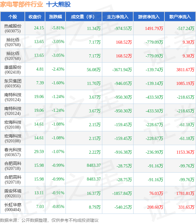 个股表现方面,家电零部件行业当日领跌股为热威股份(603075),该股当日报收24.15,下跌5.81%,成交量11.34万,主力资金净流出974.55万元。拾比佰(920768)以下跌3.05%紧随其后,该股当日成交量7.17万,主力资金净流入168.52万元。除此之外,拾比佰(920768)、康盛股份(002418)、东贝集团(601956)均进入当日熊股之列。具体个股列表见下表: