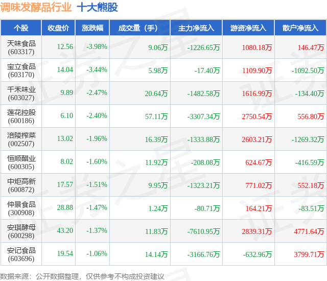 个股表现方面,调味发酵品行业当日领跌股为天味食品(603317),该股当日报收12.56,下跌3.98%,成交量9.06万,主力资金净流出1226.65万元。宝立食品(603170)以下跌3.44%紧随其后,该股当日成交量5.98万,主力资金净流出17.4万元。除此之外,千禾味业(603027)、莲花控股(600186)、涪陵榨菜(002507)均进入当日熊股之列。具体个股列表见下表: