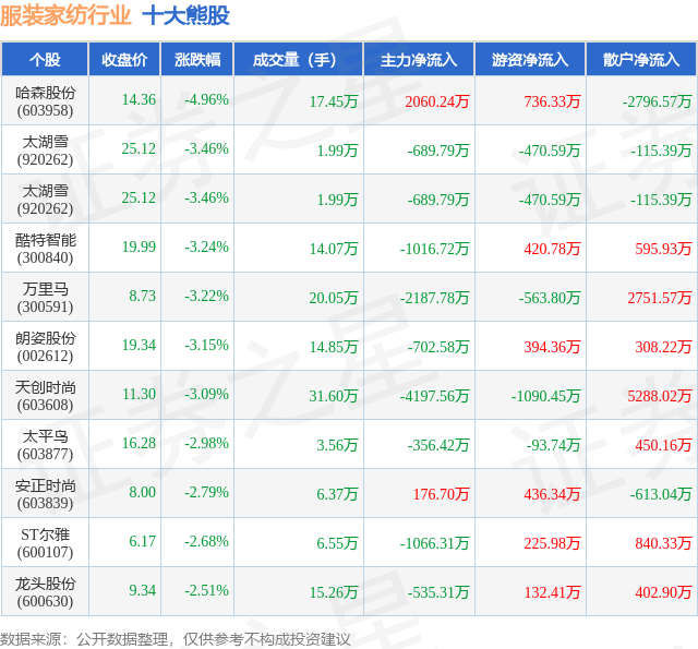 个股表现方面,服装家纺行业当日领跌股为哈森股份(603958),该股当日报收14.36,下跌4.96%,成交量17.45万,主力资金净流入2060.24万元。太湖雪(920262)以下跌3.46%紧随其后,该股当日成交量1.99万,主力资金净流出689.79万元。除此之外,太湖雪(920262)、酷特智能(300840)、万里马(300591)均进入当日熊股之列。具体个股列表见下表: