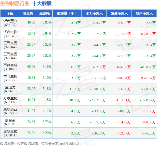 个股表现方面,生物制品行业当日领跌股为近岸蛋白(688137),该股当日报收49.5,下跌6.95%,成交量3.91万,主力资金净流出893.28万元。沃森生物(300142)以下跌6.84%紧随其后,该股当日成交量162.88万,主力资金净流出2.36亿元。除此之外,三元基因(920344)、三元基因(920344)、百普赛斯(301080)均进入当日熊股之列。具体个股列表见下表: