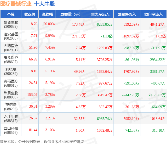 个股表现方面,医疗器械行业当日领涨股为凯普生物(300639),该股当日报收8.7,上涨20.0%,成交量173.48万,主力资金净流出8233.85万元。达安基因(002030)以上涨9.99%紧随其后,该股当日成交量271.53万,主力资金净流出1.13亿元。除此之外,大博医疗(002901)、康众医疗(688607)、利德曼(300289)均进入当日牛股之列。具体个股列表见下表: