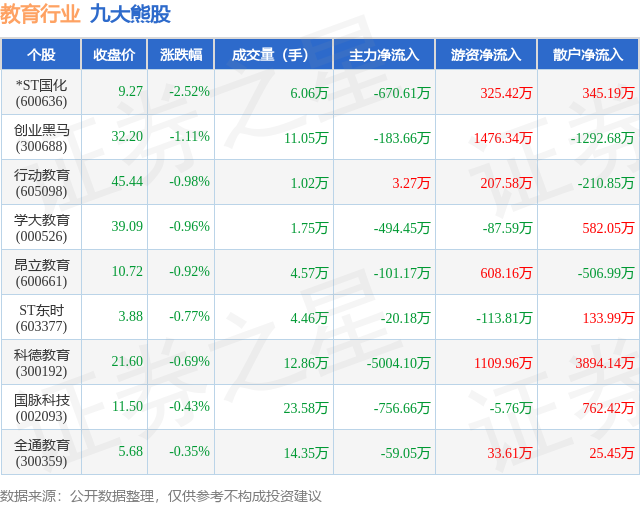 个股表现方面,教育行业当日领跌股为*ST国化(600636),该股当日报收9.27,下跌2.52%,成交量6.06万,主力资金净流出670.61万元。创业黑马(300688)以下跌1.11%紧随其后,该股当日成交量11.05万,主力资金净流出183.66万元。除此之外,行动教育(605098)、学大教育(000526)、昂立教育(600661)均进入当日熊股之列。具体个股列表见下表: