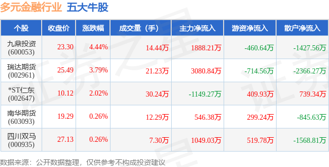 个股表现方面,多元金融行业当日领涨股为九鼎投资(600053),该股当日报收23.3,上涨4.44%,成交量14.44万,主力资金净流入1888.21万元。瑞达期货(002961)以上涨3.79%紧随其后,该股当日成交量21.23万,主力资金净流入3080.84万元。除此之外,*ST仁东(002647)、南华期货(603093)、四川双马(000935)均进入当日牛股之列。具体个股列表见下表: