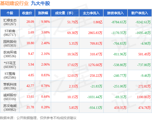 个股表现方面,基础建设行业当日领涨股为汇绿生态(001267),该股当日报收28.09,上涨9.98%,成交量51.79万,主力资金净流入1.8亿元。ST岭南(002717)以上涨3.68%紧随其后,该股当日成交量69.38万,主力资金净流入2865.83万元。除此之外,园林股份(605303)、农尚环境(300536)、*ST花王(603007)均进入当日牛股之列。具体个股列表见下表: