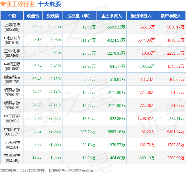 个股表现方面,专业工程行业当日领跌股为上海港湾(605598),该股当日报收64.55,下跌3.74%,成交量12.09万,主力资金净流出5693.33万元。中国中冶(601618)以下跌3.08%紧随其后,该股当日成交量311.24万,主力资金净流出8324.51万元。除此之外,三维化学(002469)、中铝国际(601068)、时空科技(605178)均进入当日熊股之列。具体个股列表见下表:
