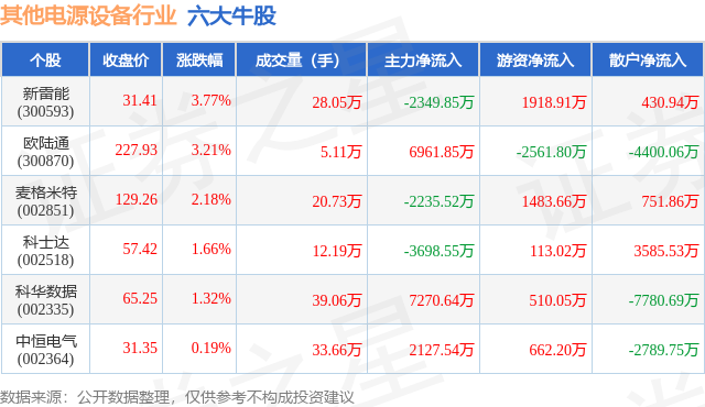 个股表现方面,其他电源设备行业当日领涨股为新雷能(300593),该股当日报收31.41,上涨3.77%,成交量28.05万,主力资金净流出2349.85万元。欧陆通(300870)以上涨3.21%紧随其后,该股当日成交量5.11万,主力资金净流入6961.85万元。除此之外,麦格米特(002851)、科士达(002518)、科华数据(002335)均进入当日牛股之列。具体个股列表见下表: