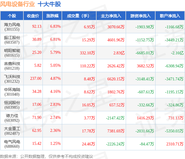 个股表现方面,风电设备行业当日领涨股为海力风电(301155),该股当日报收92.13,上涨6.83%,成交量6.95万,主力资金净流入3070.66万元。振江股份(603507)以上涨6.81%紧随其后,该股当日成交量15.29万,主力资金净流入4601.96万元。除此之外,明阳智能(601615)、吉鑫科技(601218)、飞沃科技(301232)均进入当日牛股之列。具体个股列表见下表: