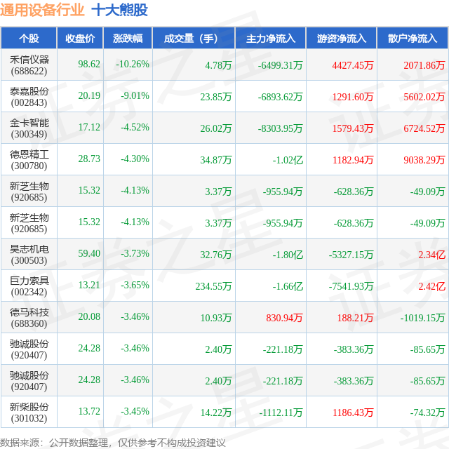 个股表现方面,通用设备行业当日领跌股为禾信仪器(688622),该股当日报收98.62,下跌10.26%,成交量4.78万,主力资金净流出6499.31万元。泰嘉股份(002843)以下跌9.01%紧随其后,该股当日成交量23.85万,主力资金净流出6893.62万元。除此之外,金卡智能(300349)、德恩精工(300780)、新芝生物(920685)均进入当日熊股之列。具体个股列表见下表: