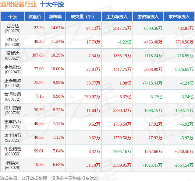 个股表现方面,通用设备行业当日领涨股为四方达(300179),该股当日报收22.2,上涨14.67%,成交量94.12万,主力资金净流入5817.75万元。欧科亿(688308)以上涨11.24%紧随其后,该股当日成交量17.79万,主力资金净流出1.22亿元。除此之外,精智达(688627)、宇晶股份(002943)、正泰电源(002150)均进入当日牛股之列。具体个股列表见下表: