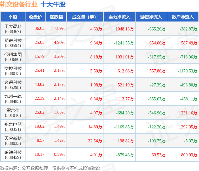 个股表现方面,轨交设备行业当日领涨股为工大高科(688367),该股当日报收36.63,上涨7.89%,成交量4.63万,主力资金净流入1048.13万元。朗进科技(300594)以上涨4.9%紧随其后,该股当日成交量9.34万,主力资金净流出1241.55万元。除此之外,今创集团(603680)、交控科技(688015)、必得科技(605298)均进入当日牛股之列。具体个股列表见下表: