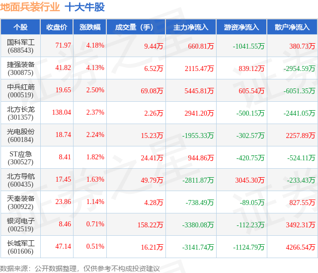 个股表现方面,地面兵装行业当日领涨股为国科军工(688543),该股当日报收71.97,上涨4.18%,成交量9.44万,主力资金净流入660.81万元。捷强装备(300875)以上涨4.13%紧随其后,该股当日成交量6.52万,主力资金净流入2115.47万元。除此之外,中兵红箭(000519)、北方长龙(301357)、光电股份(600184)均进入当日牛股之列。具体个股列表见下表: