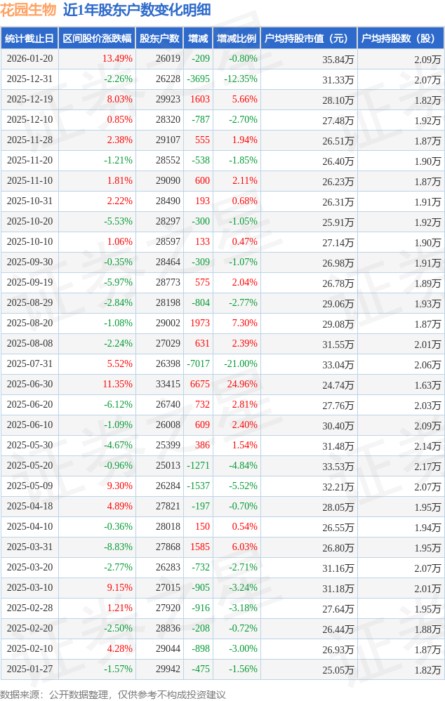 从股价来看,2025年12月31日至2026年1月20日,花园生物区间涨幅为13.49%,在此期间股东户数减少209.0户,减幅为0.8%。