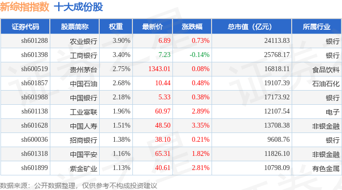 新综指(000017)指数十大成份股详情如下: