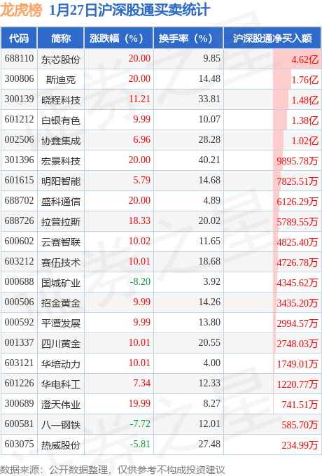 龙虎榜中有沪股通/深股通专用席位(北向资金)现身的个股共34家,其中东芯股份以净买入4.62亿元排名第一。详情见下表: