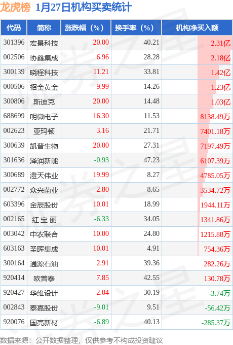 当日公布的交易所龙虎榜中有机构专用席位现身的个股共41家,其中宏景科技以净买入2.31亿元排名第一。详情见下表: