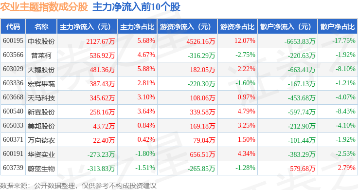 资金流向方面,农业主题(000122)指数成份股当日主力资金净流出合计3.6亿元,游资资金净流入合计2.21亿元,散户资金净流入合计1.39亿元。成份股资金流向详情见下表: