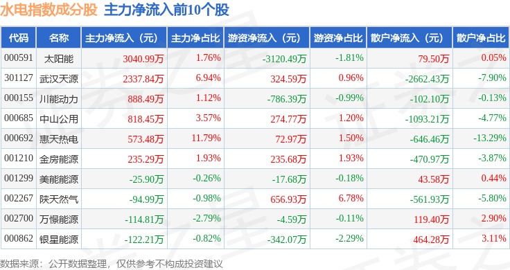 资金流向方面,水电指数(399234)成份股当日主力资金净流出合计6.8亿元,游资资金净流入合计9995.33万元,散户资金净流入合计5.8亿元。成份股资金流向详情见下表: