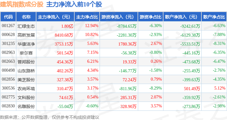 资金流向方面,建筑指数(399235)成份股当日主力资金净流出合计3245.82万元,游资资金净流出合计5006.1万元,散户资金净流入合计8251.92万元。成份股资金流向详情见下表: