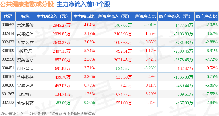 资金流向方面,公共健康(399277)指数成份股当日主力资金净流出合计23.06亿元,游资资金净流入合计7.81亿元,散户资金净流入合计15.26亿元。成份股资金流向详情见下表: