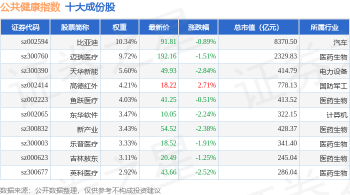 公共健康(399277)指数十大成份股详情如下: