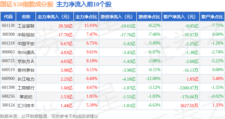 资金流向方面,国证A50(399310)指数成份股当日主力资金净流入合计4.35亿元,游资资金净流出合计36.91亿元,散户资金净流入合计32.55亿元。成份股资金流向详情见下表: