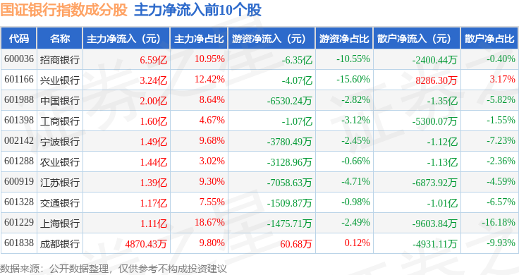 资金流向方面,国证银行(399431)指数成份股当日主力资金净流入合计21.34亿元,游资资金净流出合计11.02亿元,散户资金净流出合计10.32亿元。成份股资金流向详情见下表: