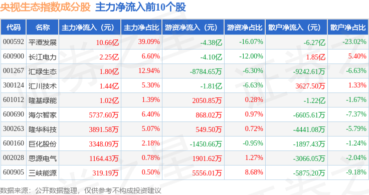 资金流向方面,央视生态(399556)指数成份股当日主力资金净流出合计40.95亿元,游资资金净流入合计1.93亿元,散户资金净流入合计39.02亿元。成份股资金流向详情见下表: