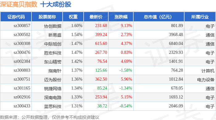 证券之星消息,1月27日,深证高贝(399662)指数报收于2719.93点,涨0.87%,成交3270.85亿元,换手率3.66%。当日该指数成份股中,上涨的有52家,协创数据以9.13%的涨幅领涨,下跌的有48家,天赐材料以4.17%的跌幅领跌。