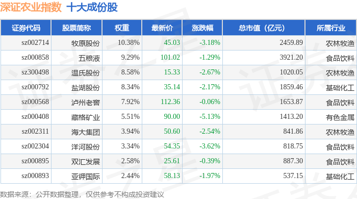 深证农业(399669)指数十大成份股详情如下: