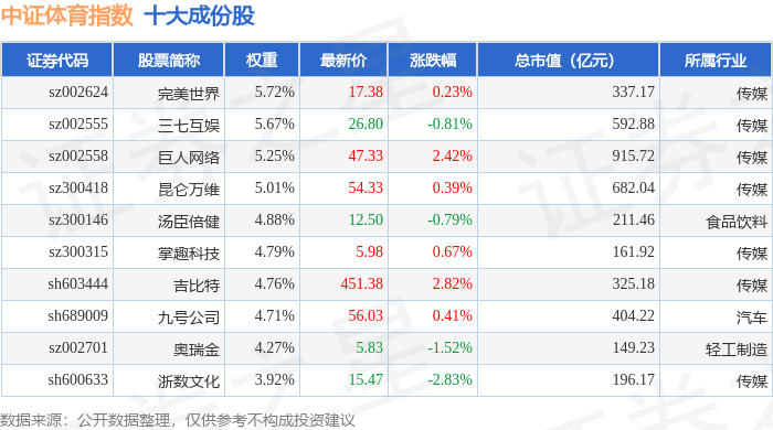 中证体育(399804)指数十大成份股详情如下: