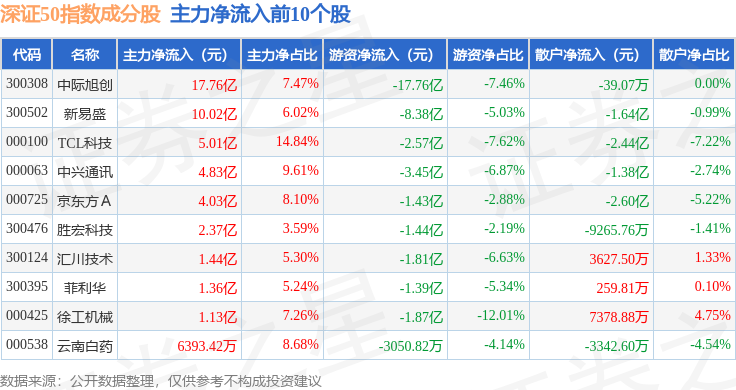 资金流向方面,深证50(399850)指数成份股当日主力资金净流出合计18.57亿元,游资资金净流出合计32.33亿元,散户资金净流入合计50.9亿元。成份股资金流向详情见下表: